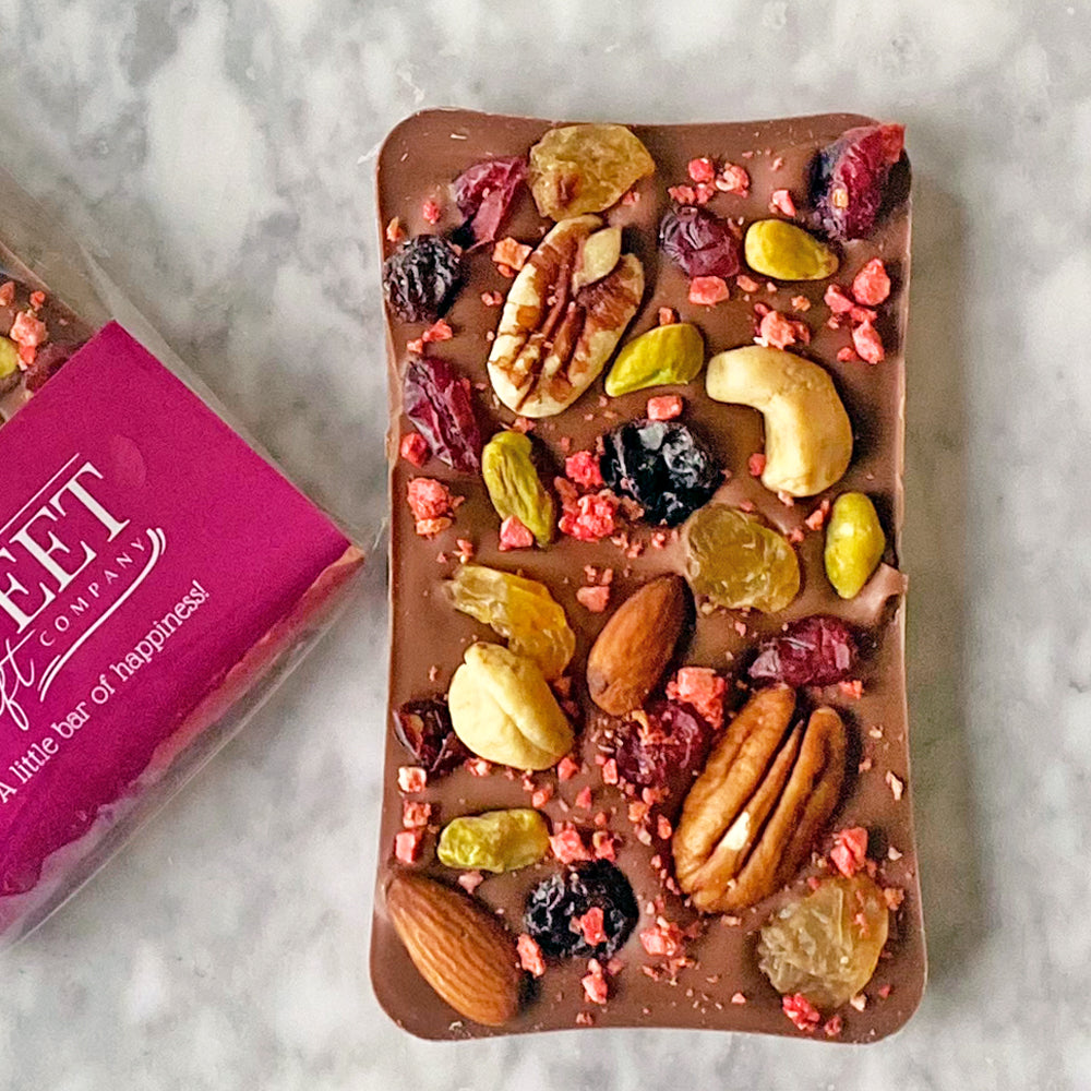 A handmade milk chocolate bar made with 100% Belgian chocolate. Topped with an array of fruit & nuts including pistachios, almonds, pecans, cranberries, golden raisins and strawberry pieces.