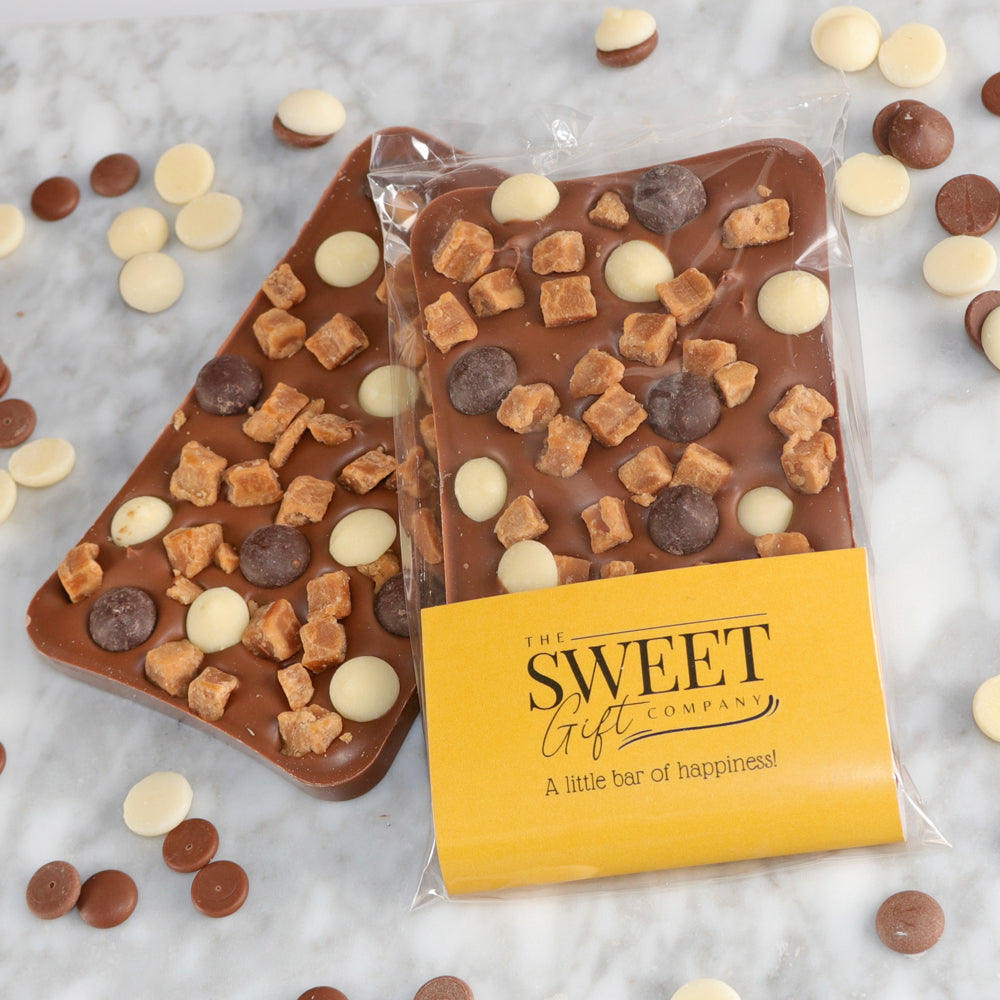 A handmade milk chocolate bar made with 100% Belgian chocolate, topped with clotted cream fudge squares.