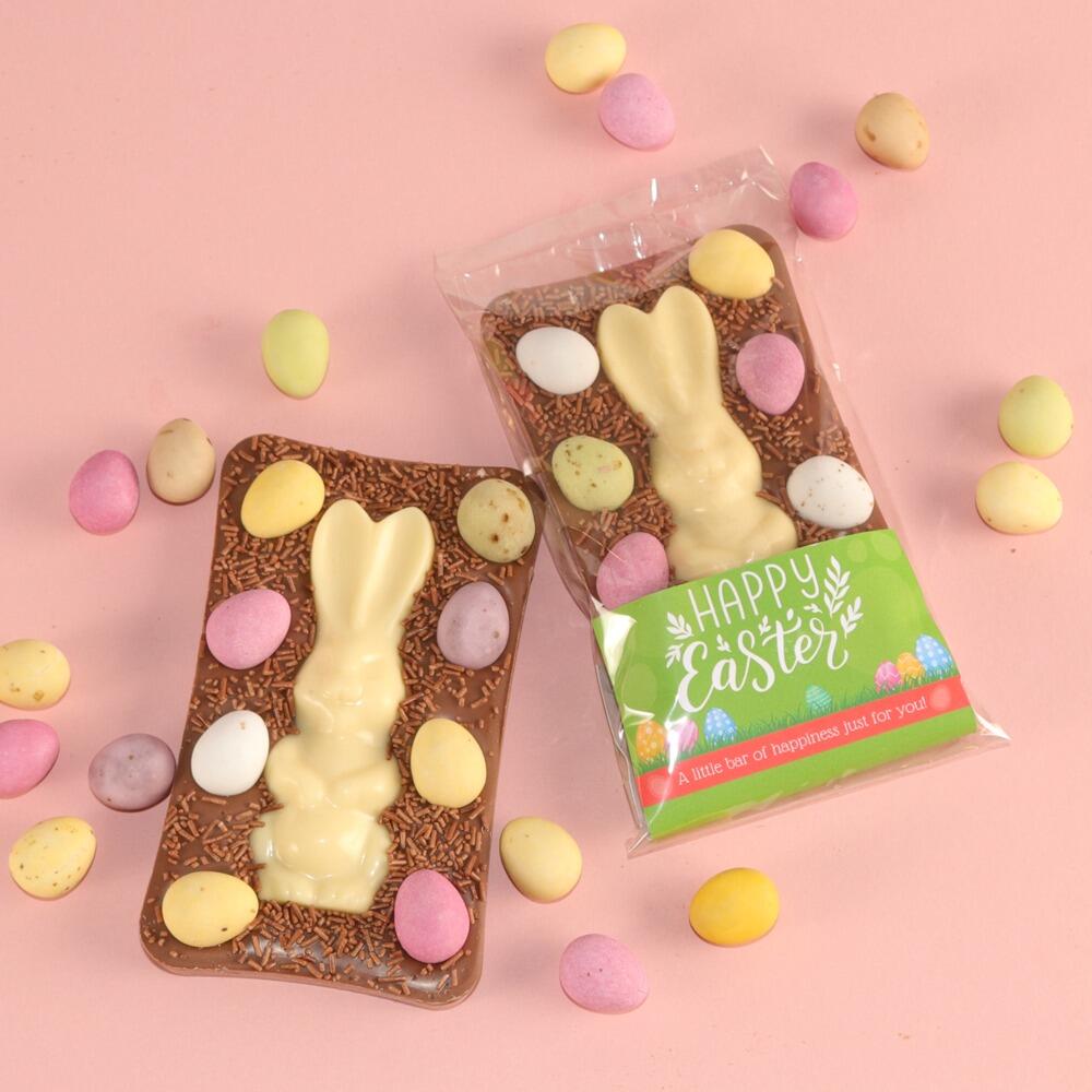 This delicious handmade Easter bar is made from Belgian milk chocolate, topped with a Belgian white chocolate Easter bunny and decorated with an Easter classic - mini eggs!