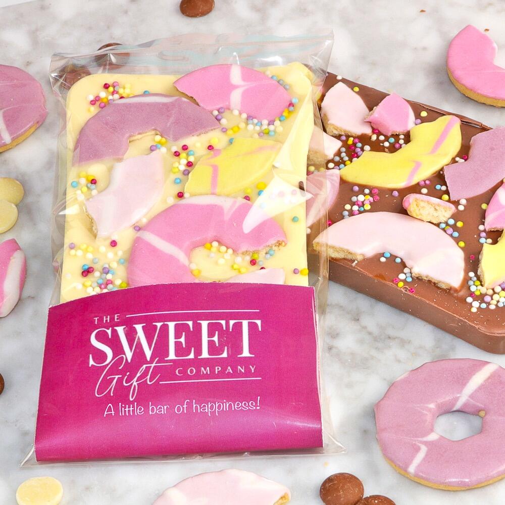 A handmade milk chocolate bar made with 100% Belgian chocolate and topped with everyone's favourite colourful iced biscuits - Party Rings! And finished off with colourful sprinkles. Let the party begin!